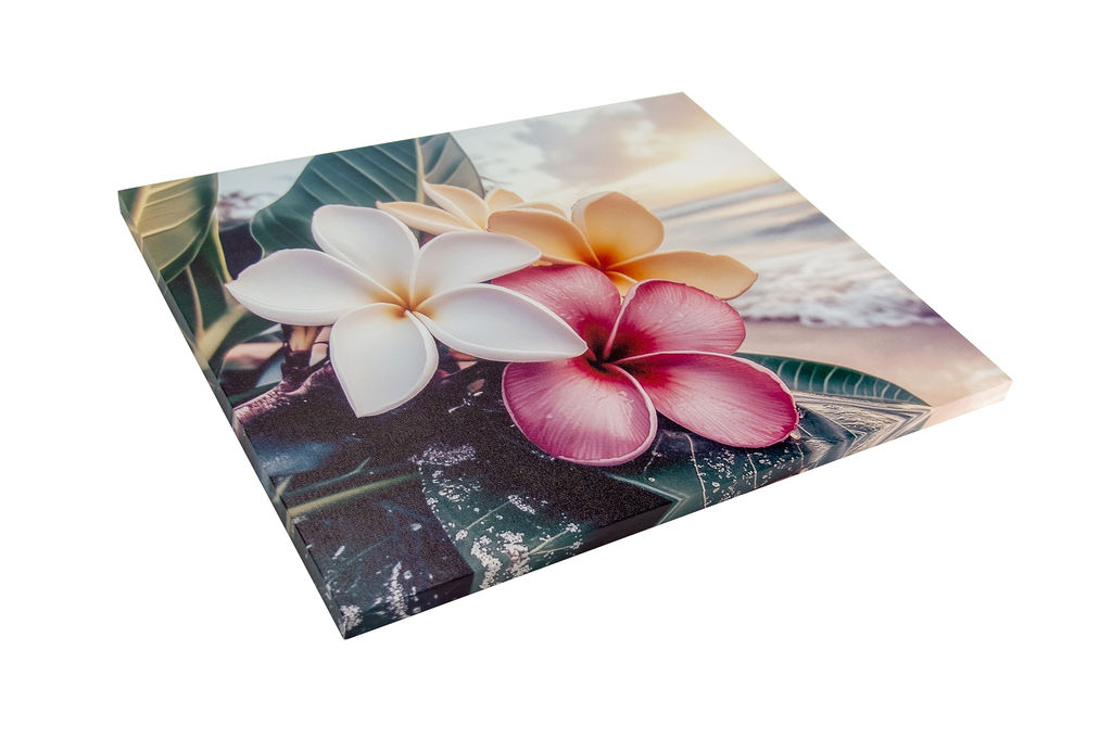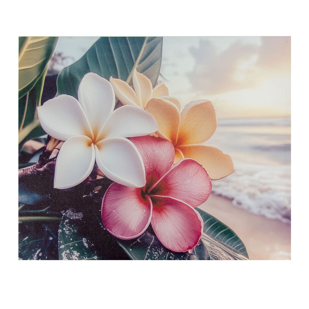 Unique and Colorful Water-Proof Color Canvas Print to Hang on the Wall – An Assortment of 3 Different Beach Background Scenes with Tropical Plumeria Flowers in the Foreground – A Truly Eye-Catching Decorative Accent That Looks Great Grouped Together to Bring Paradise Home – Must Be Ordered in Multiples of 3
