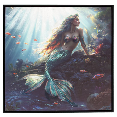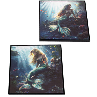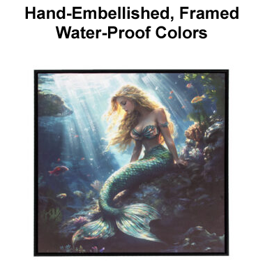 High-Quality, Hand-Embellished Gel Giclee Wall Decor – This is an Assortment of Two Different Mermaid Scenes That Look Great Together – Each Evocative Underwater Mermaid Square Canvas Print Has a Modern Black-Colored Floating Frame to Compliment the Artwork and is Decorated with Touches of Paint and Metallic Sparkle with Waterproof Colors – Must Be Ordered in Multiples of Two