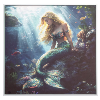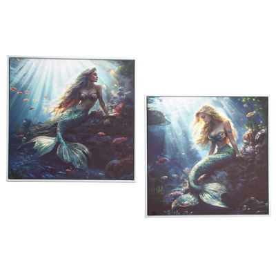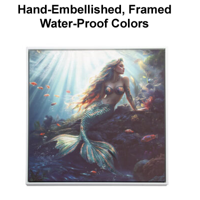 High-Quality, Hand-Embellished Gel Giclee Wall Decor – This is an Assortment of Two Different Mermaid Scenes That Look Great Together – Each Evocative Underwater Mermaid Square Canvas Print Has a Modern White-Colored Floating Frame to Compliment the Artwork and is Decorated with Touches of Paint and Metallic Sparkle with Waterproof Colors – Must Be Ordered in Multiples of Two