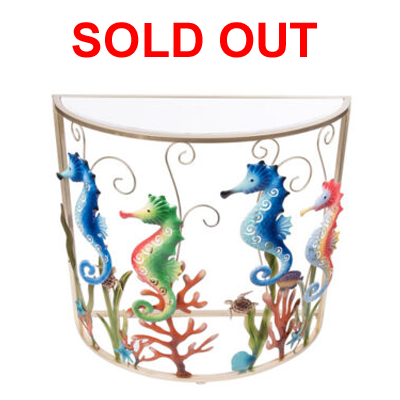 Here’s a Good-Looking Furniture Accessory with High-Style – It’s a Half Round Console Table Made of a Goldtone Metal Frame and Mirror Top to Fit Nicely Anywhere – It Will Definitely Be the Focal Point of the Room With It’s Mirror Top and Colorful Seahorses in Coral and Sea Grass on the Front Curved Panel – Must Be Shipped on a Truckline