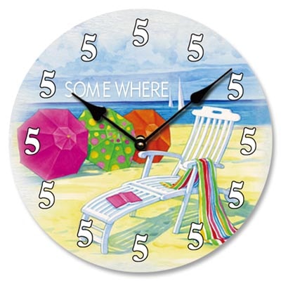 You’ve Heard the Expression…It’s 5-O’Clock Somewhere, and This Round Wall Clock is Here to Back That Up – Unique, Inviting Beach Scene on Battery Operated, Colorful Canvas-Covered Wood Clock that Say’s Every Hour is 5:00