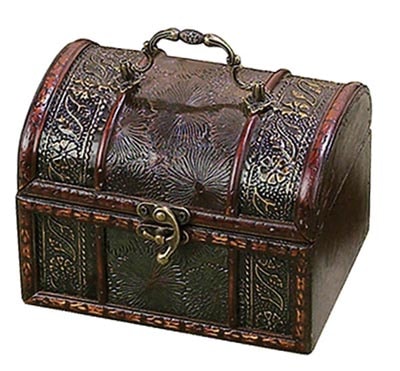 Antique Looking Wooden Chest with Hinged Dome Shaped Lid – Wood Covered in Leather Trim with Metal Hardware – Not Too Small..So It’s a Great Place to Store Stuff – Not Too Big…So You Can Fill With Items To Make a Nice Presentation Gift Basket