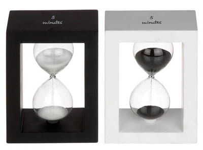 Modern Version of an Old Fashioned Classic – Assorted, Functional Five Minute Sand Timer Comes In Black or White – Glass Sand Timer is Housed Inside Wooden Cube Frame and Makes an Artistic and Usable Decorative Accessory