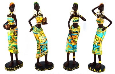 Alluring African Lady Figurine on a Base Comes Assorted in Four Different Standing Poses – Each One Dressed in a Shiny, Colorful, Two-Piece Outfit with Dangling Metal Hoop Earrings – Captures the Movement and Rhythm of Busy Village Life in Polystone. Must be Ordered in Multiples of 4.