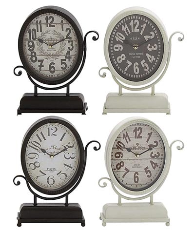 Designed with a 1920’s Flair, Deliberately Made to Show Age, This Table Top Time Piece Comes in Four Different Styles – Clock is Made of Metal, Battery Operated for an Outstanding Antique Reproduction Decorative Accent. Must be Ordered in Multiples of 4.