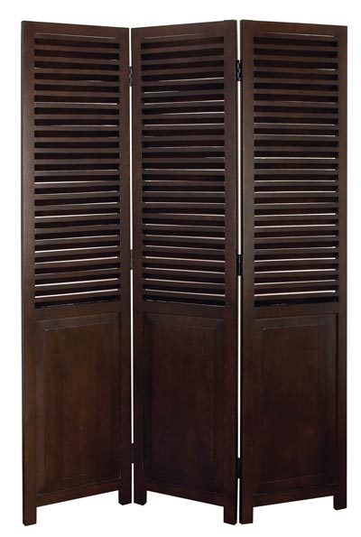 All Wood and Finished in a Dark Stain with Clean Lines, This Three-Panel Room Divider Fits Any Decor, be it Modern, Tropical, Oriental, or Traditional – Each Panel has Slightly Open Design to the Top and Solid Bottom Reminscient of Bahama Shutters