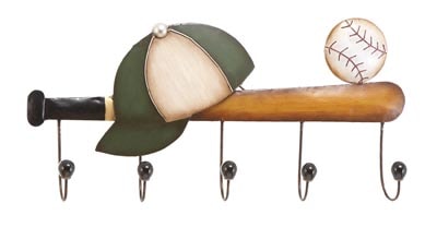 Boyishly Cute and Practical Wall Decoration in the Shape of Baseball Bat, Cap and Baseball with Five Coat Hooks – Perfect for Hanging Clothes, Caps, and Even a Baseball Glove – Made of Painted Metal