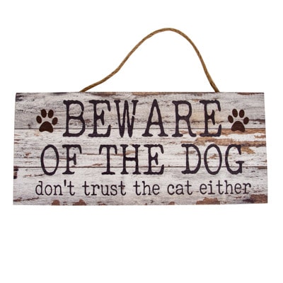 A Rectangular Wooden Warning Sign That Hangs from a Rope With a Truly Rustic and Weathered Look Offering Sage Advice to Visitors About All the Pets In the House – A Fun Gift People Will Want to Buy for Themselves to Take Home and Hang Up for a Laugh