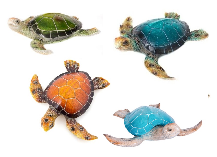 Assorted Large Size Turtle Figurine with a Smooth Shiny Colored Shell and Textured Skin – A Decorative Seaside Accessory Made of Polystone with Great Realistic Detailing at a Great Price – Even Has Slots Underneath So It Can Be a Coastal Wall Decoration Also. Sold As Assorted of Four From Each Color.