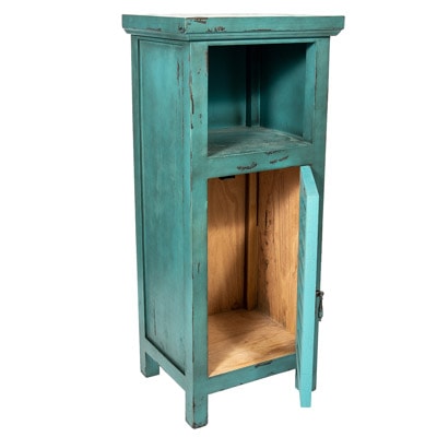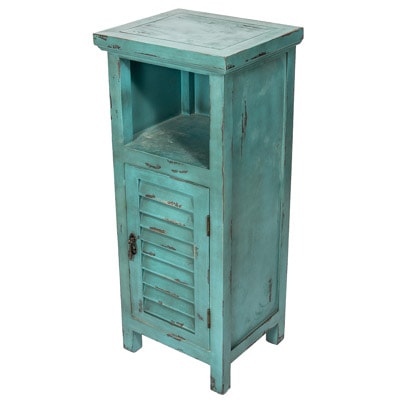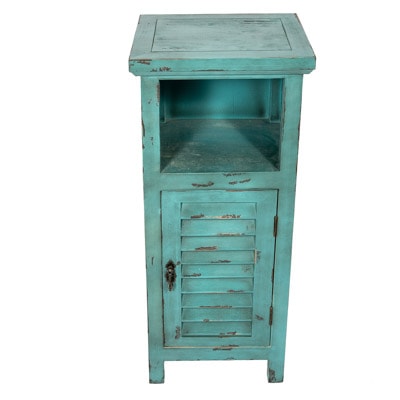 This Useful Wooden Cabinet is a Charming Furniture Accessory Suitable in the Bedroom, Bathroom, Hall, Office or Entryway – Painted in a Aqua Blue Color, There’s a Hinged Shutter Door on the Front with a Shelf Above the Lower Storage
