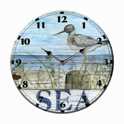 This Round Ceramic Wall Hanging Clock is Also an Attractive Rustic Coastal Decoration – A Shorebird, a Post, Some Sea Oats and a View Towards the Ocean Above the Word “Sea” Make This Battery Operated Clock a Very Popular Item