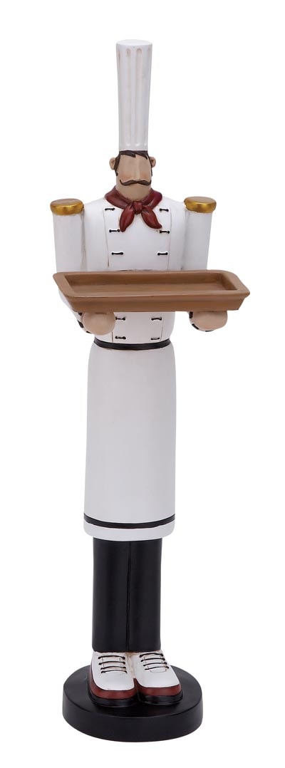 Made of Polystone With a Style Taken from the Toy Solider Bavarian Nutcrackers, this Crisp Looking Chef Figurine Holds a Tray In Front of Him Ready to Hold Treats at Home or Business Cards in a Restaurant
