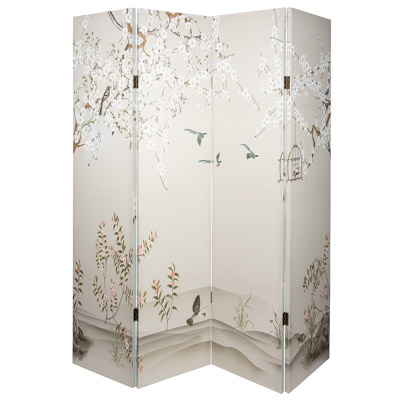 Beautiful, Rich-Looking Four Panel Canvas Covered Folding Screen – A Different Design on Each Side with Muted Color Backgrounds and Designs of Birds and Cherry Blossoms on Branches – This Oriental-Inspired Functional Furniture Accent Makes a High End Addition to Any Room