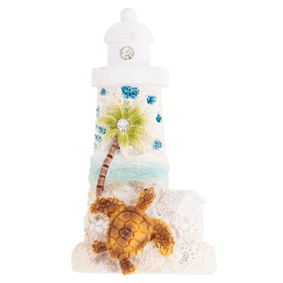 Here’s a Pretty Souvenir Item, a Polystone Magnet in the Shape of a Lighthouse and It’s Decorated with a Beach, a Palm Tree, a Sea Turtle, Glitter and Rhinestones – An Inexpensive Item for Quick Impulse Sales