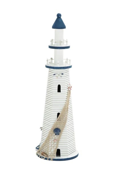 Attractive Wooden Lighthouse Painted in Crisp Blue and White and Decorated with Fish Net and Shells – Ultimate Nautical Decoration for Lighthouse Collectors and Lovers