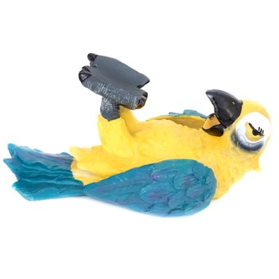 He’s Really a Drunken Parrot that Holds a Wine Bottle – A Cast Resin Tropical Blue Macaw Parrot Laying on His Back Holding Up the Bottle of Wine (Not Included) with His Feet and His Beak