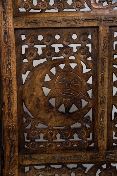 Exotic Looking Four-Panel Wooden Room Divider Screen with Ornate Open Work Cut-Out Designs of Moons and Suns on Each Panel – Enchanting Furniture Accessory with Heavenly New Age Design