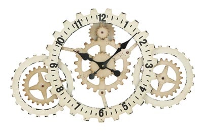 Industrial Metal Wall Art That Also Tells Time – Hands of Battery Operated Clock Revolve Around Inside Large Middle Gear Surrounded by of a Bunch of Overlapping Gears