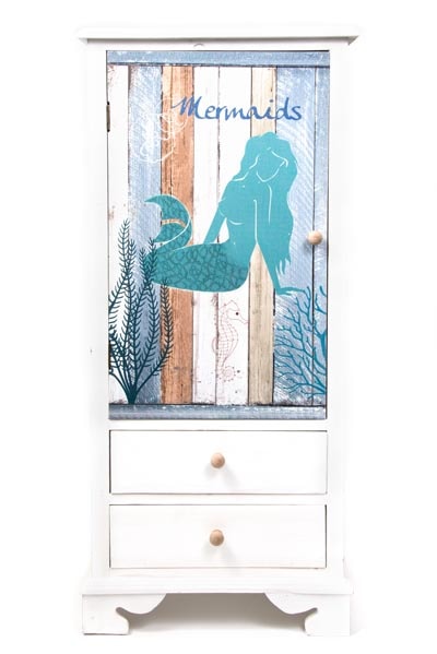 Perfect Furniture Accessory for Any Size Coastal Room, be it Bedroom, Bathroom, Living Room, Entryway – Painted Wooden Cabinet in a Shabby Chic Style with a Mermaid Stenciled on the Hinged Door and Two Drawers