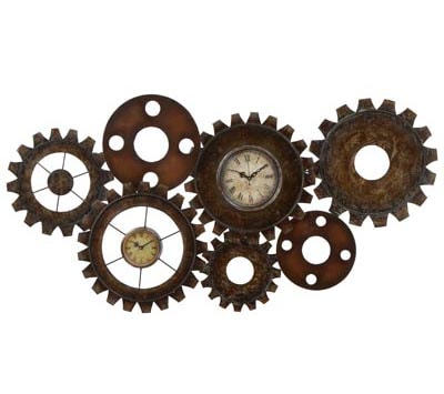 Two Clocks Inside Intriguing Industrial Looking Metal Wall Art of Sprockets, Gears and Pulleys – Two Clocks Can Be Set for Two Different Time Zones