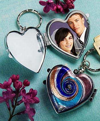 Unique Heart Shaped Locket Key Ring with Swirling Peacock Colored Murano Glass Covered Front – Opens to Mirror and Place to Put Picture – Two Shown Here One Open and One Closed – Comes with Gift Box