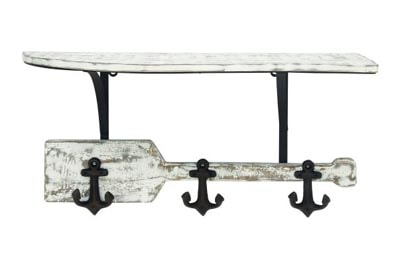It’s a Shelf to Set Things, It’s a Place to Hang Things, and Most of All, It’s a Wonderful Rustic Nautical Wall Accent – This Wooden Shelf Has An Oar Underneath with Three Metal Anchor Shaped Coat Hooks