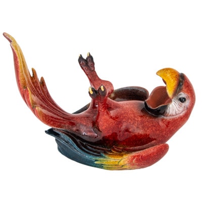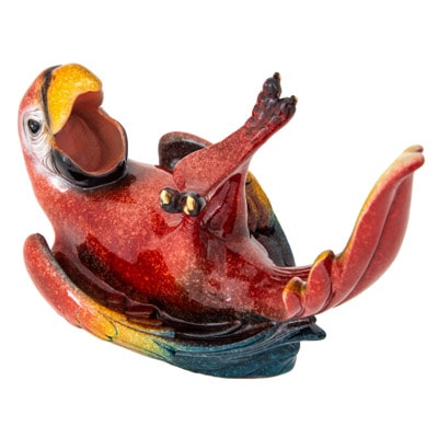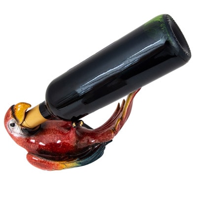 This Shiny Polystone Tropical Red Macaw Parrot is a Tad Thirsty – He’s Laying Back So He Can Hold Up a Wine Bottle (Not Included) with His Feet And Have the Corked End Go Right In His Beak to Quench His Desire for the Grape