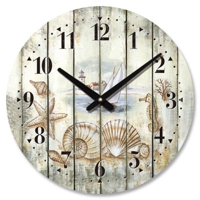 Round Wall Hanging Clock with Rustic Beach Scene – Canvas Covered Wood Clock is Battery Operated – Clock has Faux Planks Background with Sailboat, Lighthouse, Seashells, and Seahorse – It’s a Great Value
