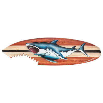 Sharks and Surfboards are Usually Not a Good Combination and You Can See Why – This Wall Hanging Wooden Surfboard Shape Has a Bite Missing and There’s an Awesome Image of a Great White Shark – For This Decorative Accent, Sharks and Surfboards Go Great Together