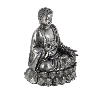 This Buddha Figurine is Seated With His Left Hand Resting on His Knee, Palm Up and Right Hand Raised – Antique Silver Colored Polystone Symbol of Enlightenment