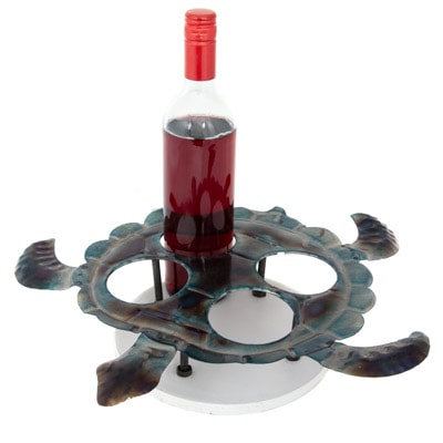 This Helpful Sea Turtle is Made of Wood and Metal and is a Decorative Stand to Hold Four Bottles of Wine for Serving or Storing – Accented with Nice Touch of Blue Highlights on the Metal – Bottle Shown Here Not Included