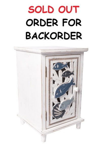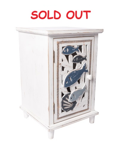 This Cabinet is the Perfect Size to Fit Anywhere You Want to Bring the Seaside Inside, It Can be a Storage Cabinet in the Bath, an End-Table in the Bedroom – There’s a Shelf Inside and a Hinged Door on the Front with a Cut-Out Design and Shapes of Fish and a Sea Shell – Made of Wood and Finished with a Shabby Chic Coastal White Wash and Accented with Blues