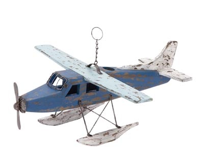 A Unique Antique Reproduction of a Model Toy Seaplane, That’s a Propeller Plane Made Land on Water – Made of Painted Wood with Metal Accents and Given Special Treatment to Show Age and Wear – An Aerial Vintage Decoration that Hangs from a Chain