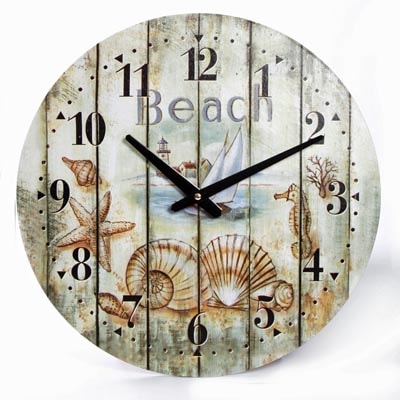Very Appealing Round Wall Hanging Clock with Whole Beach Scene – Canvas Covered Wood Clock is Battery Operated – Faux Planks Background with Weathered Looking Sailboat, Lighthouse, Seashells, and Seahorse – Price is Very Appealing, Too