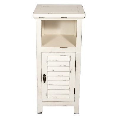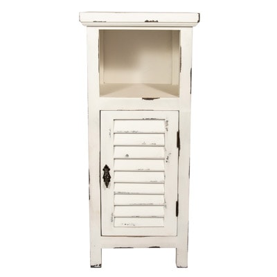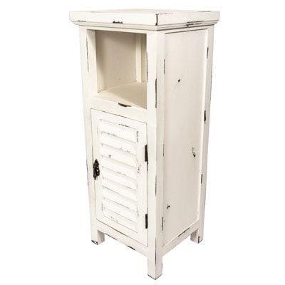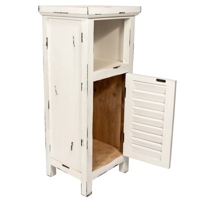 This Lovely Wooden Cabinet is a Furniture Accessory Useful in the Bedroom, Bathroom, Hall, Office or Entryway – Painted in a White Wash Finish, There’s a Hinged Shutter Door on the Front with a Shelf Above the Lower Storage